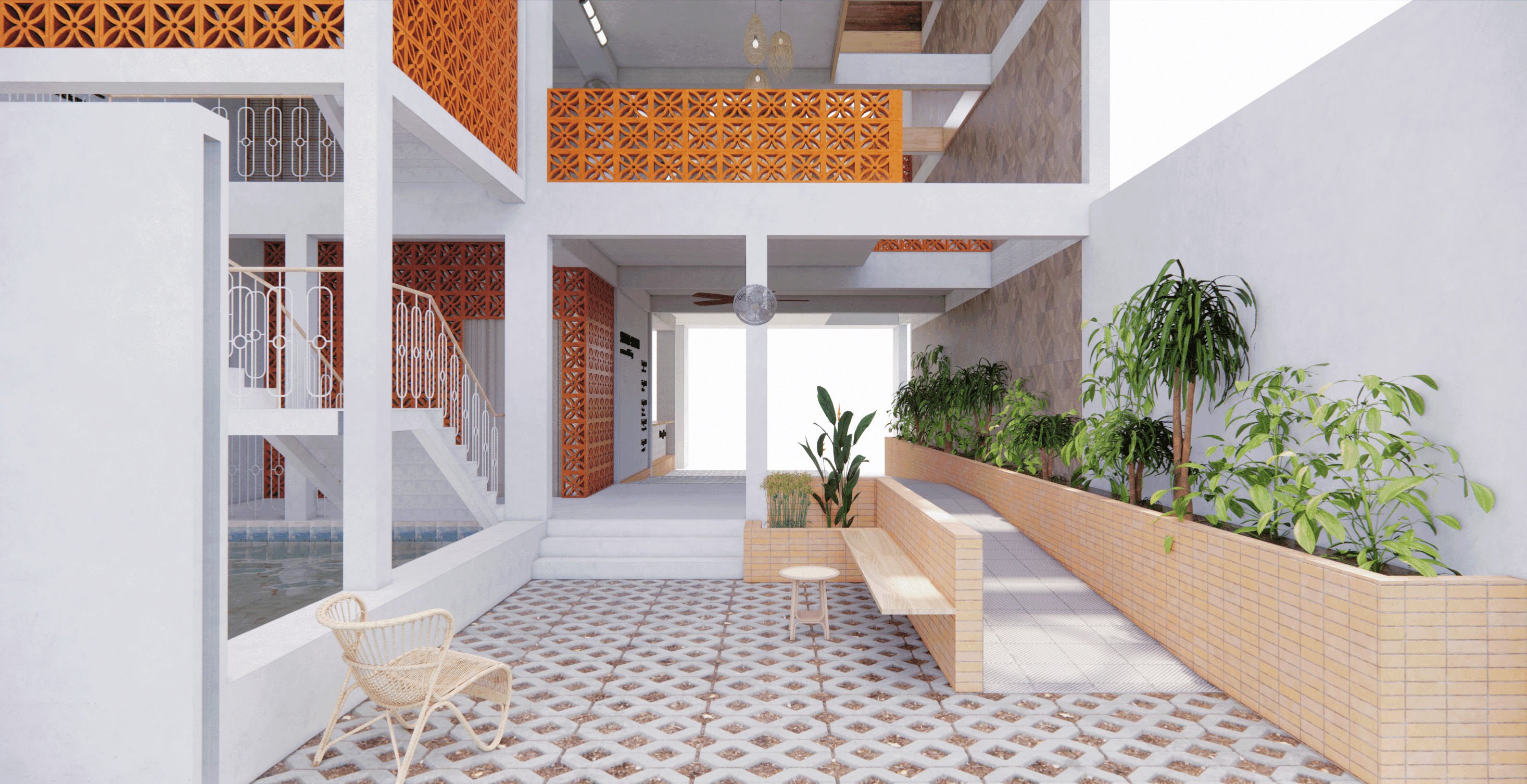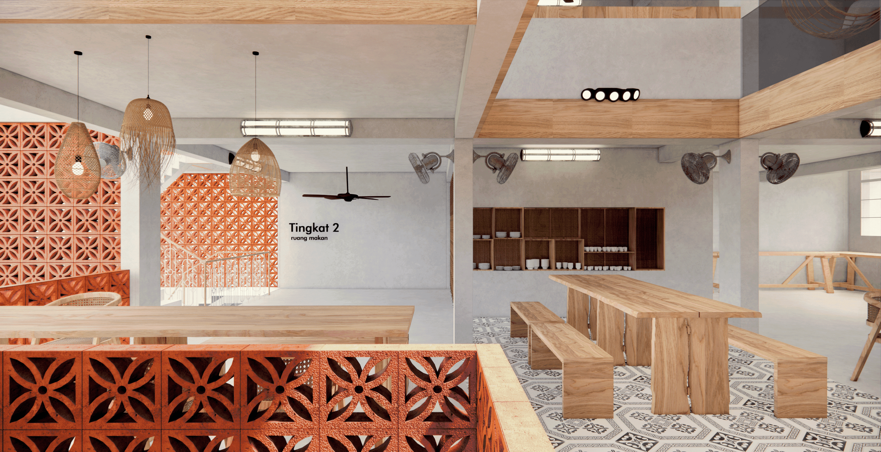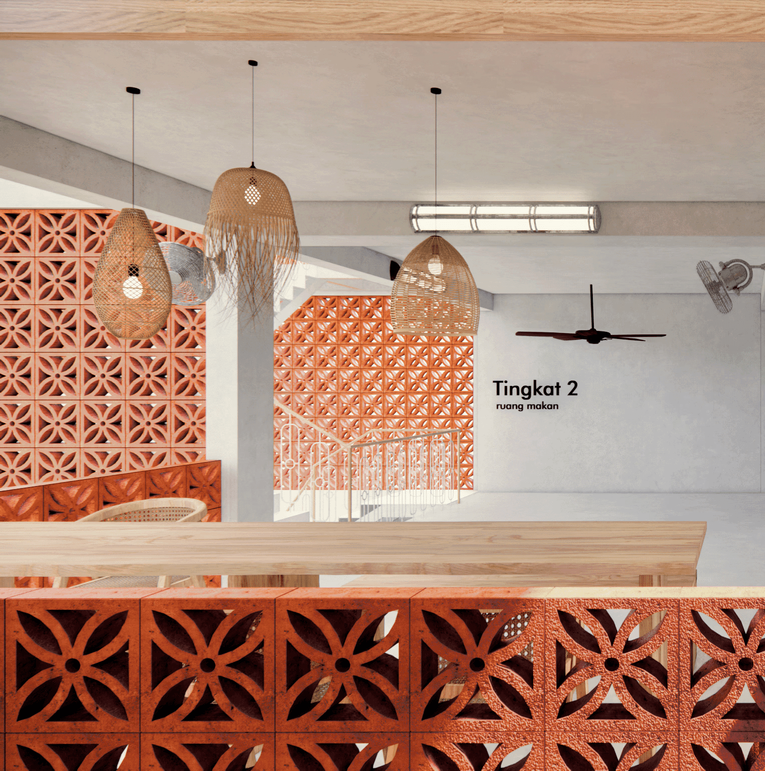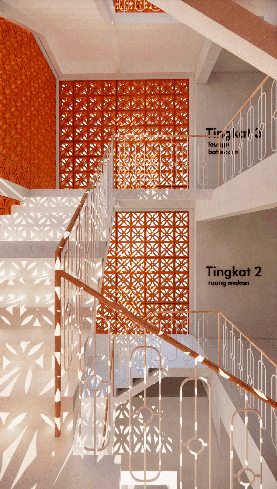 With the use of perforated bricks [with motifs], it acts as a form of barrier, whilst allowing air & light to flow within the space. The use of motifs on the bricks as well, is a homage to the immediate muslim community within the site. It represents how closely nit the muslim community is and how they treat each other equally. As well as the boldness of the community as a whole.