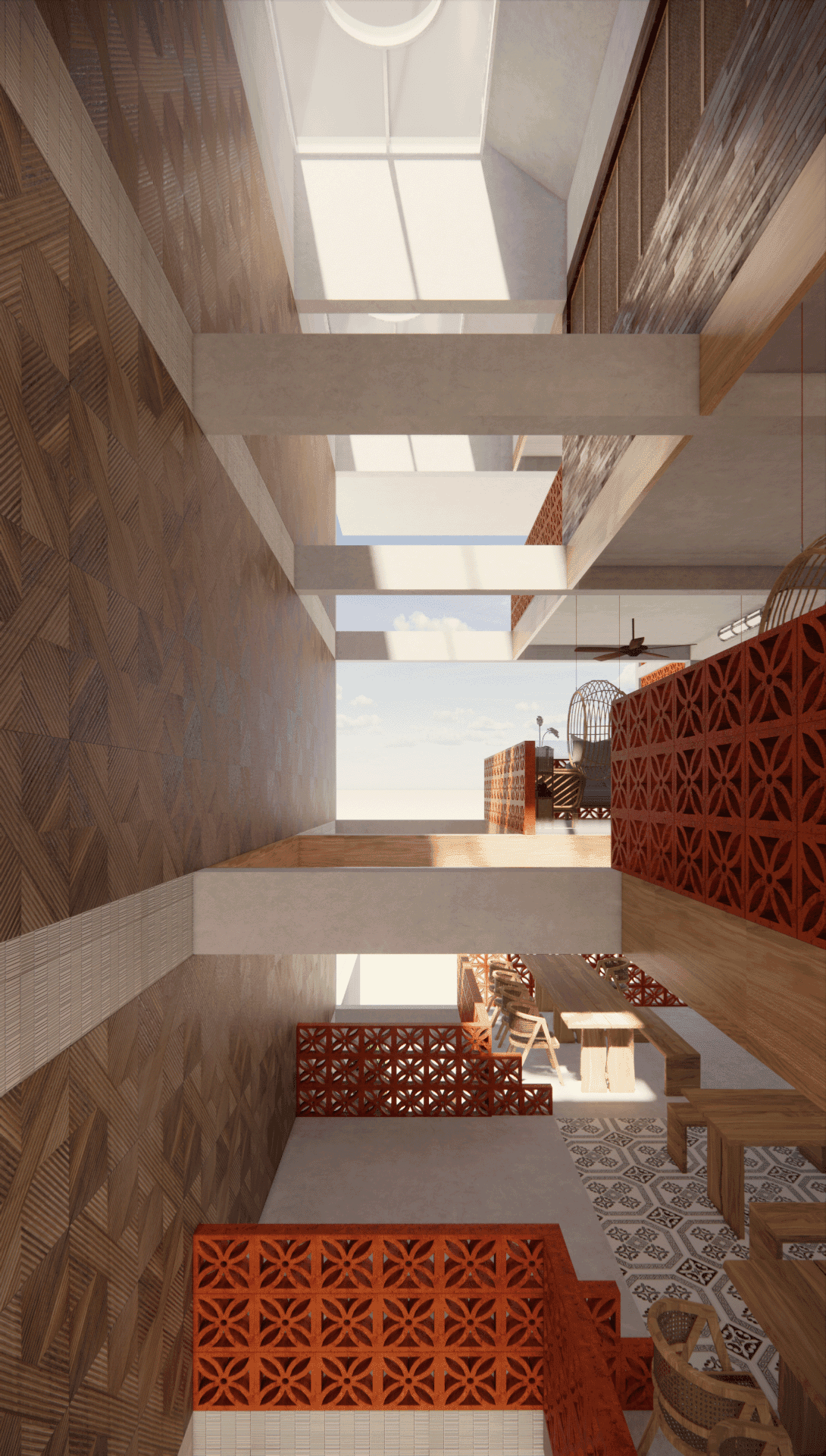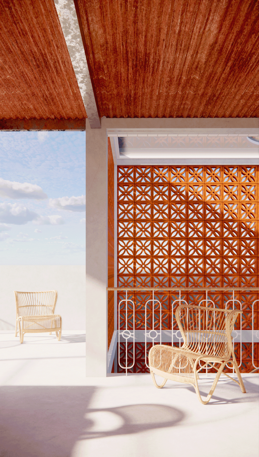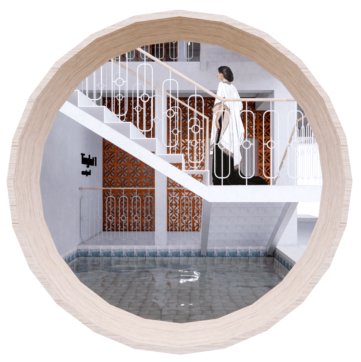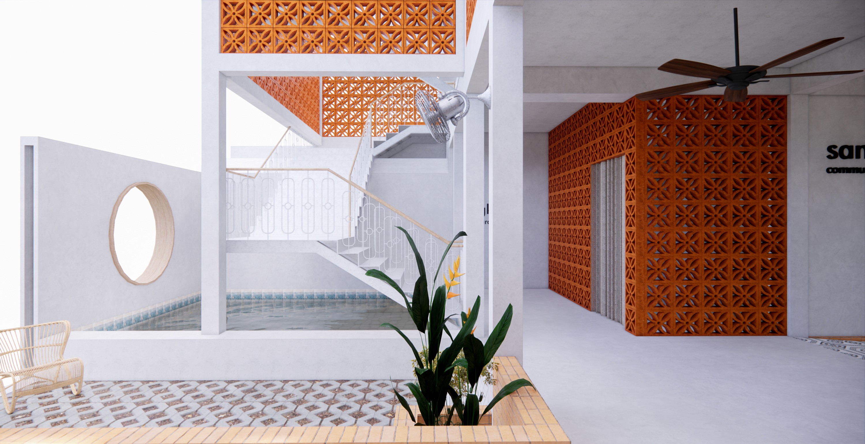 With the use of perforated bricks [with motifs], it acts as a form of barrier, whilst allowing air & light to flow within the space. The use of motifs on the bricks as well, is a homage to the immediate muslim community within the site. It represents how closely nit the muslim community is and how they treat each other equally. As well as the boldness of the community as a whole.