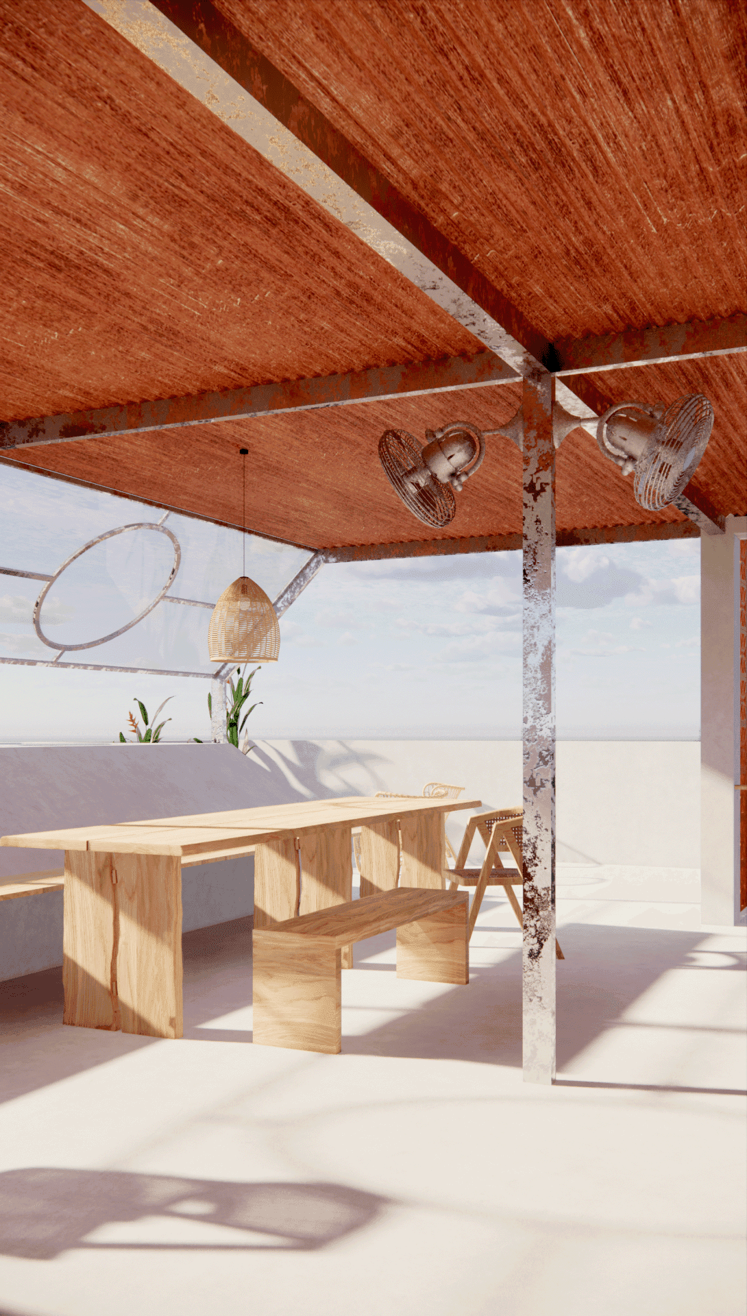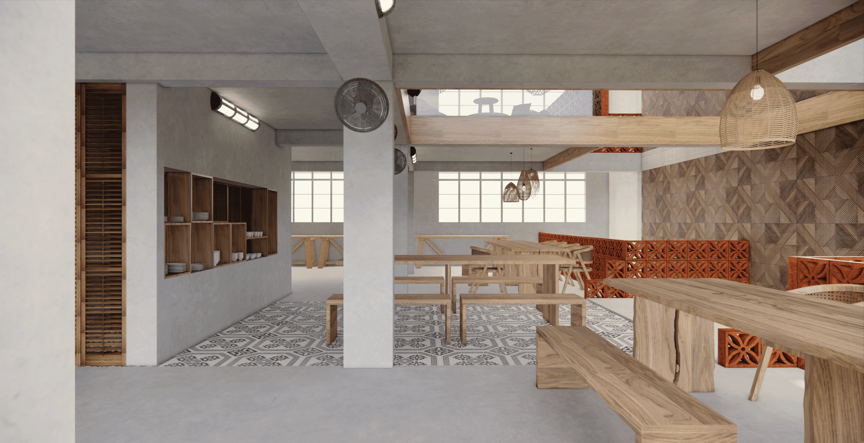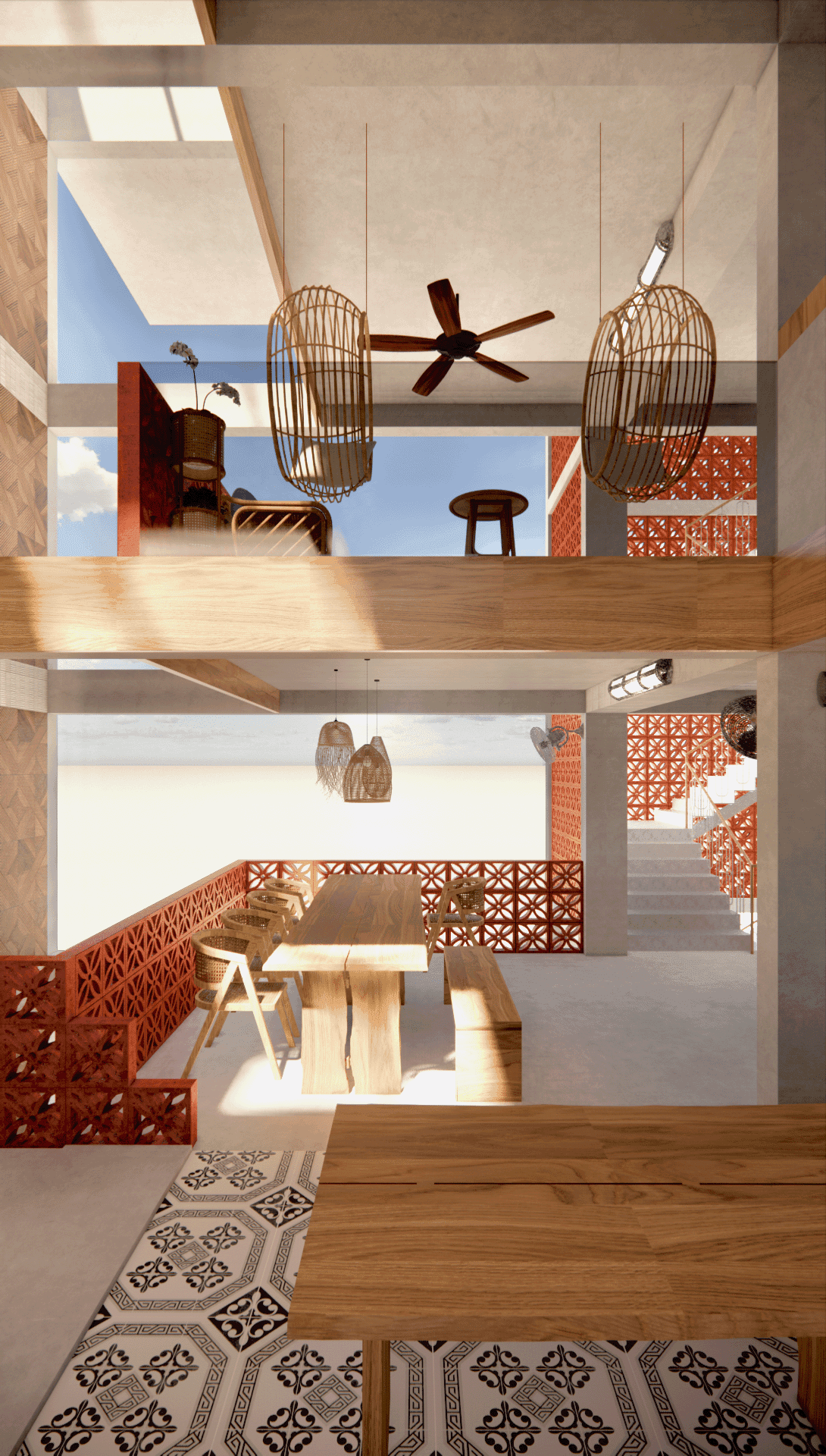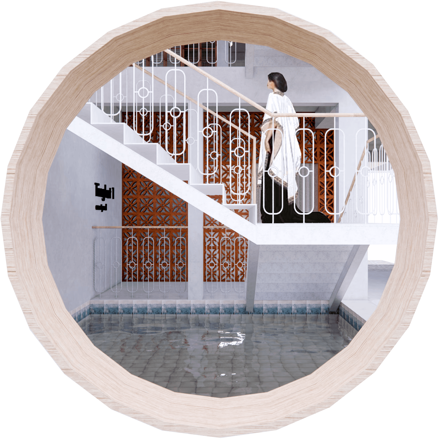 With the use of perforated bricks [with motifs], it acts as a form of barrier, whilst allowing air & light to flow within the space. The use of motifs on the bricks as well, is a homage to the immediate muslim community within the site. It represents how closely nit the muslim community is and how they treat each other equally. As well as the boldness of the community as a whole.