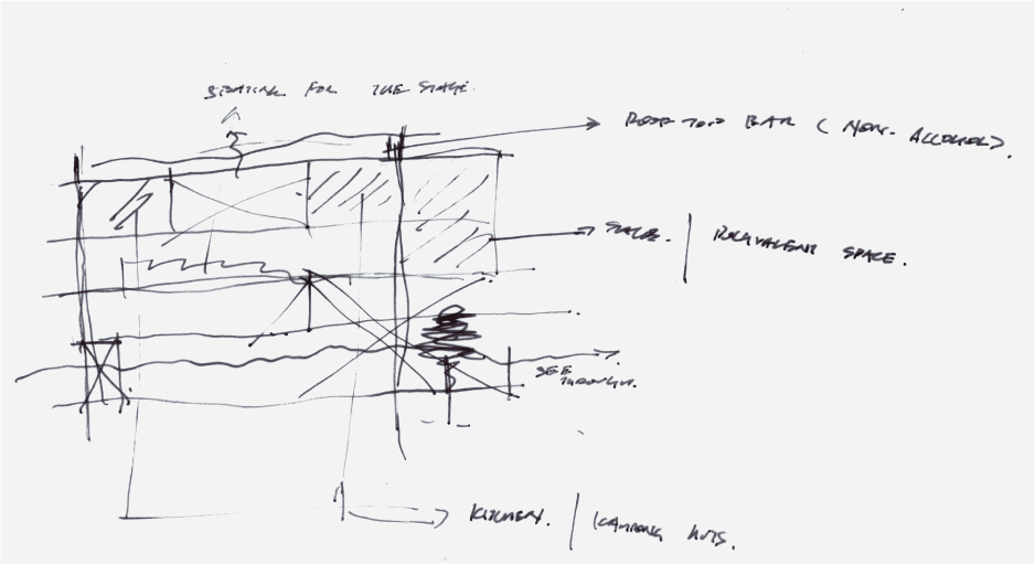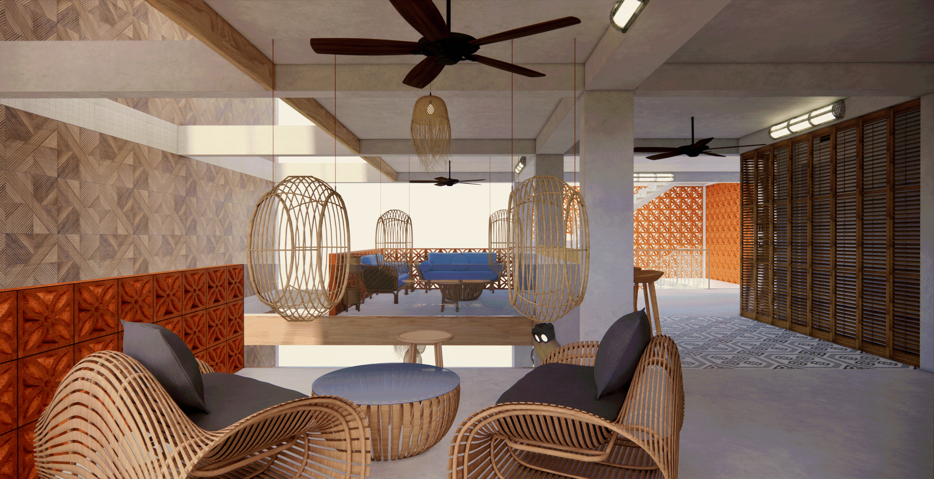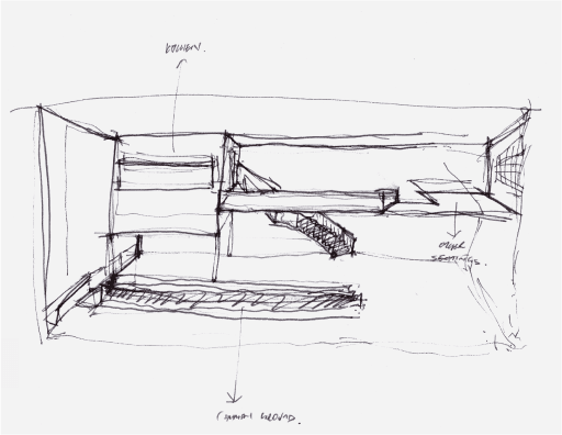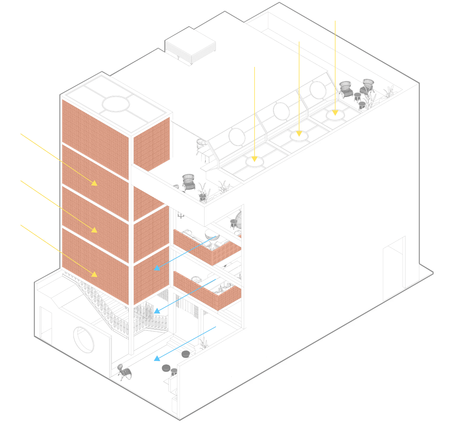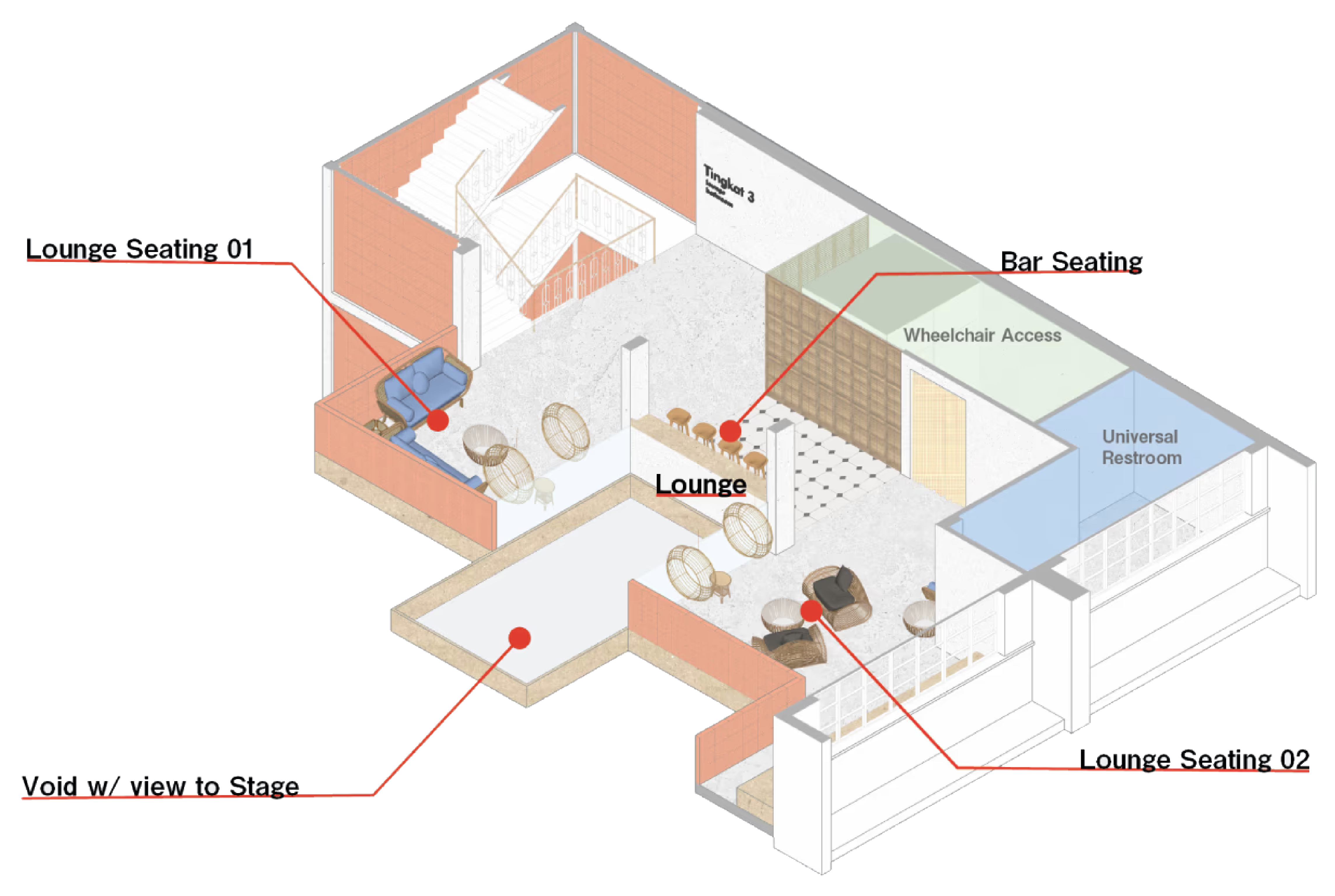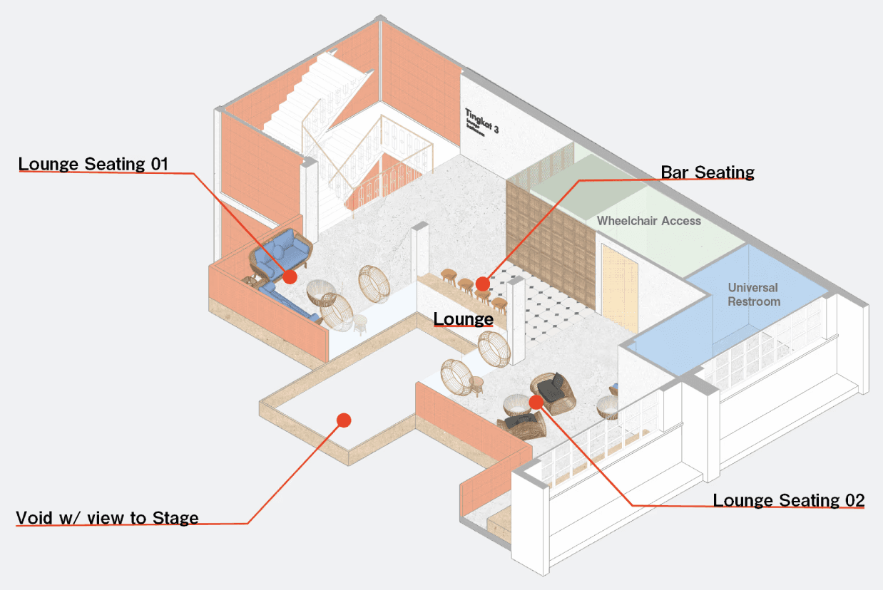 The lounge is meant for people whom enjoy the ambiance of the music from a distance. The lounge features 3 core spaces which has a top-down view of the performers through the void in the middle.