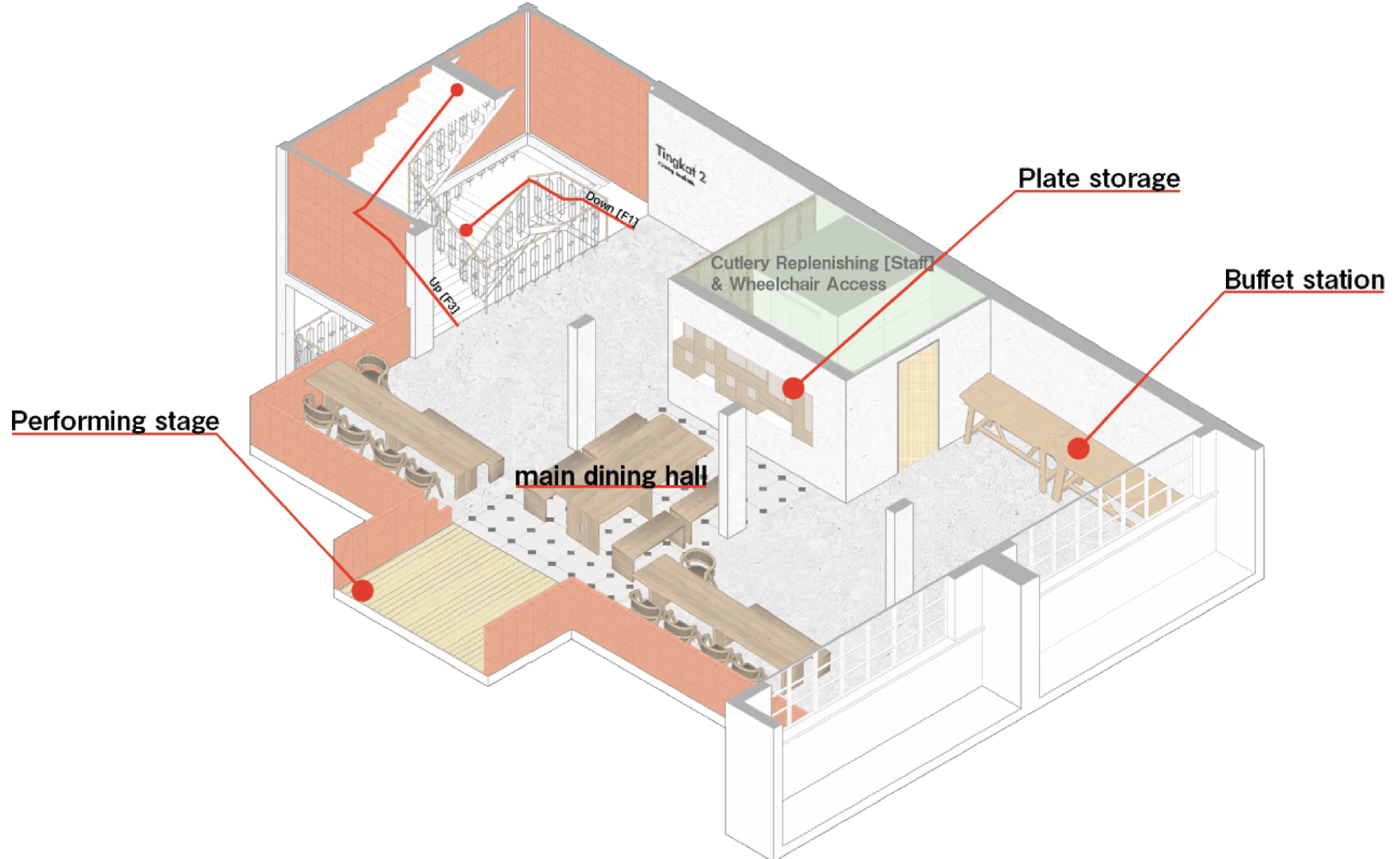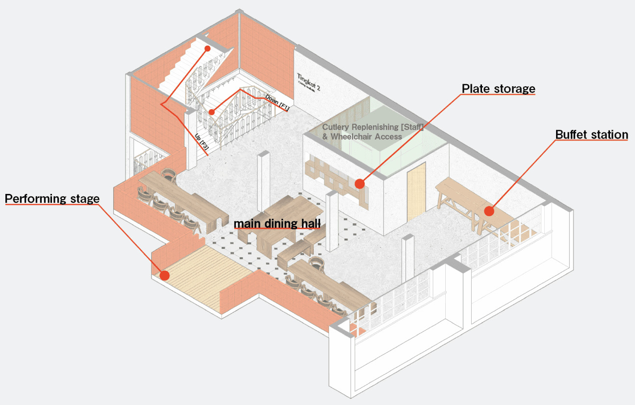 The main dining hall is arranged in a manner where the spaces are within close proximity, rather than far apart. This is done with the intention of fostering a sense of community whilst dining, and a sense of unity whilst singing along to a song that they know in common.