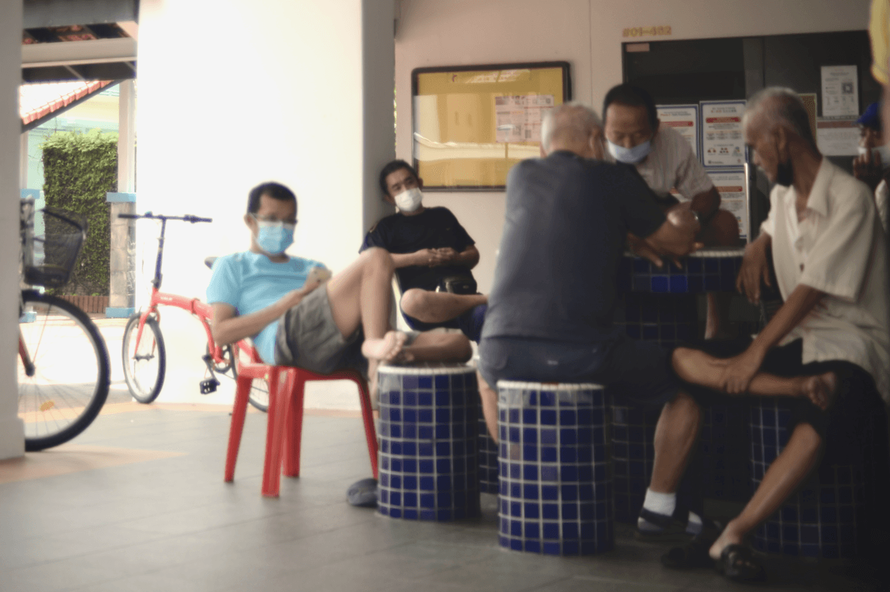 The elderly that usually sits under the void deck stays within the void deck is due to 2 reasons: shelter, and tables.